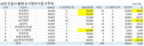 DL이앤씨[375500]는 2조6천830억원으로 지난해보다 127% 급증하며 반등에 성공했다. GS건설[006360] 역시 4조1천522억원으로 33.5% 증가, 4위를 차지했다. 반면 대우건설[047040]은 1조1천162억원으로 전년 대비 62% 감소하며 고전하고 있다.