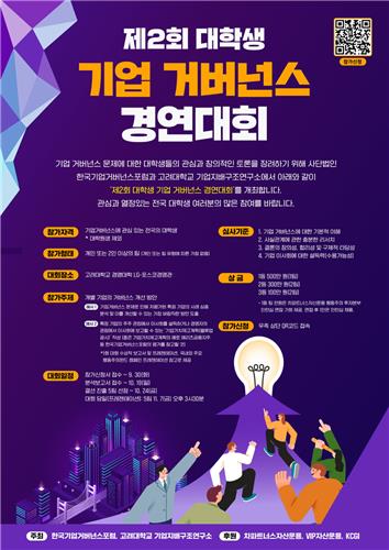 (서울=연합인포맥스) 김학성 기자 = 한국기업거버넌스포럼과 고려대학교 기업지배구조연구소는 '제2회 대학생 기업 거버넌스 경연대회'를 개최한다고 26일 밝혔다.