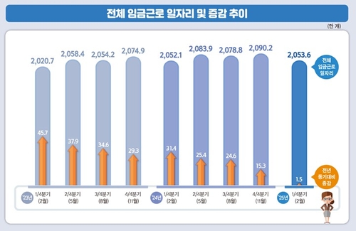 통계청이 26일 발표한 '2025년 1분기 임금근로 일자리 동향'에 따르면 지난 2월 기준 임금근로 일자리는 총 2천53만6천개로, 전년 동기 대비 1만5천개 늘었다.