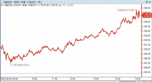 26일 외환시장에 따르면 달러-원 환율은 이날 오후 5시34분 현재 전장 대비 12.70원 상승한 1,397.40원에 거래됐다.