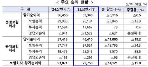 27일 금융감독원이 발표한 '2025년 상반기 보험회사 경영실적(잠정)'에 따르면 올해 상반기 22개 생명보험사와 31개 손해보험사의 당기순이익은 7조9천750억원으로 전년 동기대비 15.0% 줄었다.