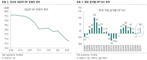이경수 하나증권 연구원은 27일 보고서에서 "코스피의 3분기 영업이익 전망치는 76조8천억 원 수준으로 2분기 역성장에서 벗어날 것으로 예상되지만, 한 달 전에 비해 1.3% 하향 조정되는 등 우려가 커지고 있다"고 진단했다.