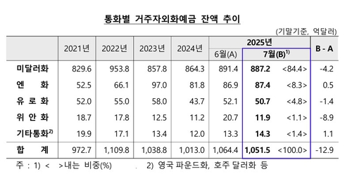 27일 한국은행에 따르면 지난 7월말 외국환은행의 거주자 외화예금은 전달보다 12억9천만달러 감소한 1천51억5천만달러로 집계됐다.