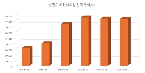 27일 연합인포맥스 발행사별 회사채 발행 만기 통계(화면번호 4290)에 따르면 한국전력의 이날 기준 원화채권 및 단기자금, 외화표시채권(KP)의 총잔액은 82조5천458억원으로 집계됐다. 지난 3년간 326조원가량을 발행하며 차환 등을 진행했고, 24조원 정도가 새로 불어났다.