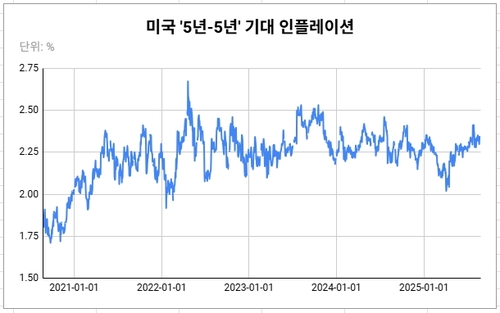 (서울=연합인포맥스) 김성진 기자 = 미국 연방준비제도(연준ㆍFed)를 장악하려는 도널드 트럼프 대통령의 시도가 강도를 더해가는 와중에도 중앙은행이 중시하는 '5년-5년'(지금부터 5년 후부터 5년간) 기대 인플레이션은 아직 가시적인 상승세를 보이지 않고 있는 것으로 나타났다.
