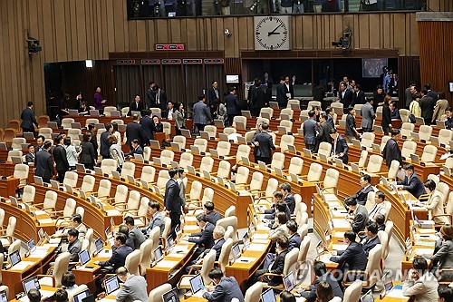 국민의힘은 산은법 개정안 처리에 앞서 야당 몫으로 추천한 국가인권위원 선출안이 부결되면서 본회의장을 퇴장, 표결에 불참했다.
