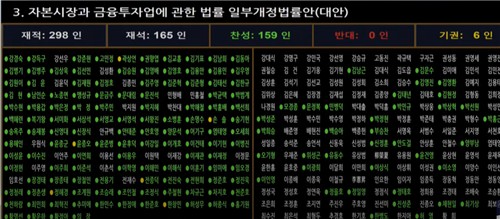 국회는 27일 본회의를 열어 이러한 내용의 자본시장법 일부개정법률안을 재석 165명 중 찬성 159표, 기권 6표로 가결했다.