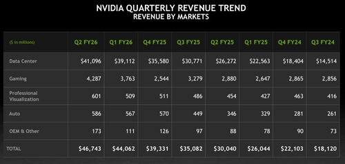 매출의 90% 가까이를 차지하는 데이터센터 매출은 410억9천600만달러로 전분기 대비 5%, 전년 대비 56% 각각 늘었다.