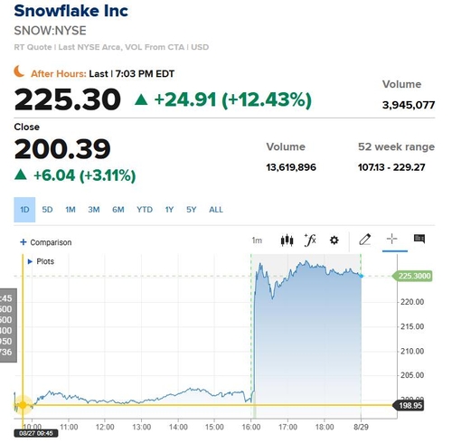 스노우플레이크는 시간외거래에서 정규장 대비 24.91달러(12.43%) 오른 225.30달러에 거래됐다.