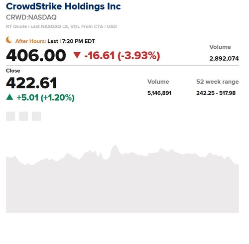 크라우드스트라이크는 시간외거래에서 한때 8% 급락했으나 낙폭을 만회해 오전 8시20분 현재 16.61달러(3.93%) 내린 406.00달러에 거래됐다.