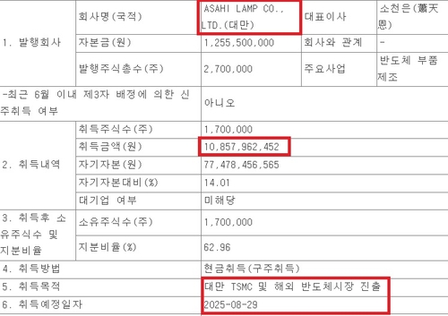 에프엔에스테크가 M&A에 나선 건 대만 TSMC 공급을 비롯해, 글로벌 반도체 시장에 진출하기 위해서다. TSMC와 미국 어플라이드 머티어리얼즈 등을 고객사로 둔 아사히 램프를 끌어안는 형태로 해외 시장 진출에 속도를 냈다.