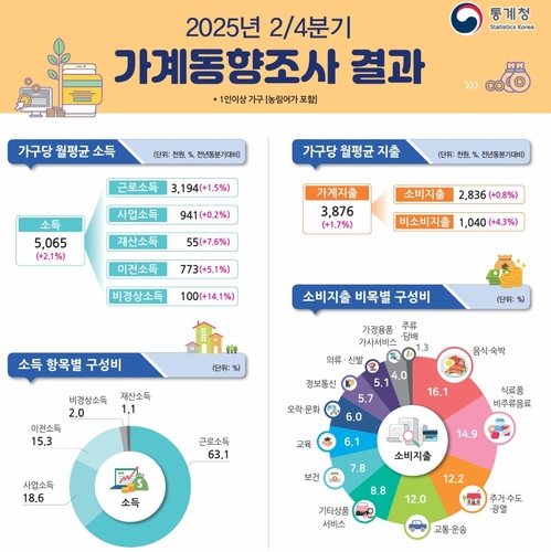 통계청은 28일 발표한 '2025년 2분기 가계동향조사 결과'에 따르면 올해 2분기 가구당 월평균 소득은 506만5천원으로 전년 동기 대비 2.1% 증가했다.