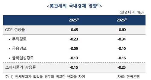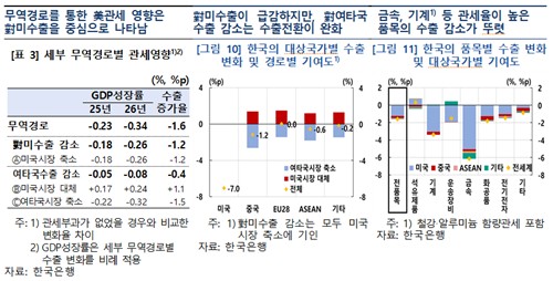 이러한 압력은 무역·금융·불확실성 경로를 통해 나타날 것으로 보면서, 특히 무역경로상 금속·기계·자동차 수출을 중심으로 영향을 크게 받을 것으로 관측했다.