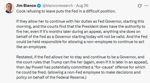27일(현지시간) 월가 베테랑인 비앙코 리서치의 짐 비앙코 대표는 최근 자신의 소셜미디어 엑스(엣 트위터) 계정에 "만일 연준이 쿡 이사의 직무 수행을 허용했는데 향후 법원에서 트럼프 대통령에게 쿡 이사를 해임할 권한이 있다고 판단한다면 쿡 이사가 연준 이사로 수행한 모든 행위가 유효하지 않게 된다"며 이같이 말했다.