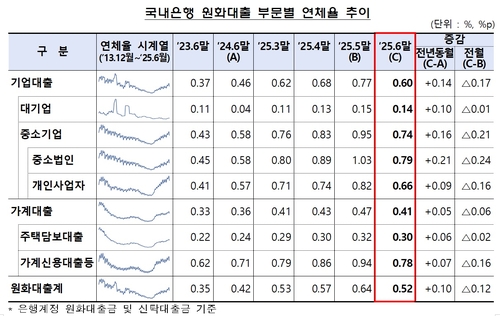 29일 금융감독원이 발표한 '2025년 6월 말 국내은행의 원화대출 연체율 현황(잠정)'에 따르면 국내은행의 원화대출 연체율(1개월 이상 원리금 연체기준)은 0.52%로 전월 말(0.64%) 대비 0.12%포인트(p) 하락했다.