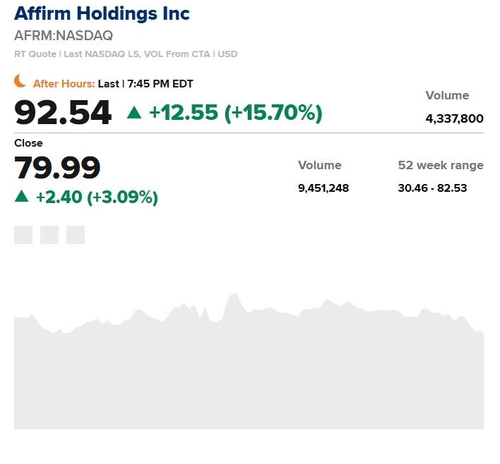 어펌 홀딩스 주가는 시간외 거래에서 정규장 대비 12.55달러(15.70%) 오른 92.54달러에 거래됐다.