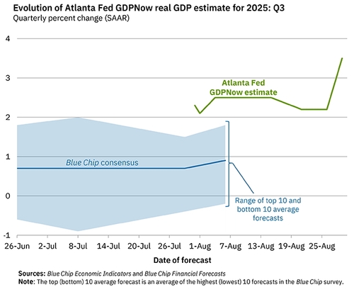 (서울=연합인포맥스) 김성진 기자 = 미국의 경제성장률을 실시간으로 추정하는 애틀랜타 연방준비은행의 'GDP 나우(now)' 모델이 29일(현지시간) 3분기 성장률을 전기대비 연율 환산 기준 3.5%로 제시했다.