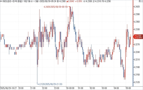 연합인포맥스의 해외금리 일중 화면(화면번호 6532)에 따르면 29일(미국 동부시간) 오후 3시 현재 뉴욕 채권시장에서 10년물 국채금리는 전 거래일 오후 3시 기준가 대비 2.00bp 오른 4.2280%에 거래됐다.