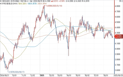 연합인포맥스의 해외금리(화면번호 6533)에 따르면 지난 29일(이하 현지시간) 10년 만기 미 국채 수익률은 전주대비 2.50bp 내린 4.2300%를 나타냈다. 2주 연속 하락했다.