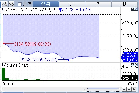 1일 연합인포맥스 신주식종합(화면번호 3536)에 따르면 오전 9시 4분 기준 코스피는 전 거래일보다 32.22포인트(1.01%) 내린 3,153.79에서 거래되고 있다.