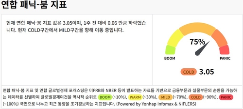 1일 연합인포맥스 패닉-붐 사이클(화면번호 8283번)에 따르면 세계 경기 활성화 정도를 가늠하는 경기 동행 지수인 연합 패닉-붐 지표는 5점 만점에 3.05를 나타냈다. 점수가 높을수록 불황에 가깝다는 의미다.