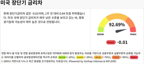미국 장단기 금리차의 경우 -0.01로 한 달 전 -0.12에서 역전 폭이 축소했다. 지표가 작을수록 향후 경기침체 가능성을 시사하는 만큼, 역전 폭 완화는 긍정적으로 해석된다. 다만 여전히 올 6월 이래 패닉 국면을 이어가는 중이다.