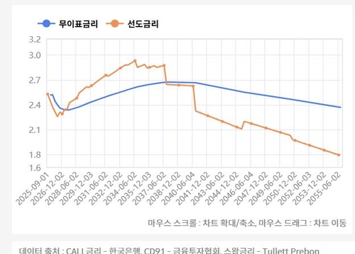 1일 연합인포맥스 스와프 수익률 곡선 분석 도구(화면번호 2620)에 따르면 양도성예금증서(CD) 91일물 금리를 기준으로 한 3개월물 선도금리는 내년 6월 2.25%를 찍고 반등하는 흐름으로 추정된다.