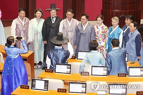 한복 입고 등장한 민주…국힘은 검은 양복·근조 리본 '극과 극'