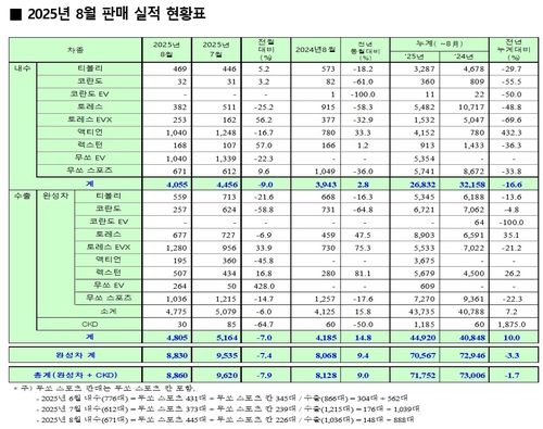 KGM은 8월 내수 4천55대, 수출 4천805대를 포함 총 8천860대를 판매했다고 1일 밝혔다. 전년 동월 대비 9% 늘었다.