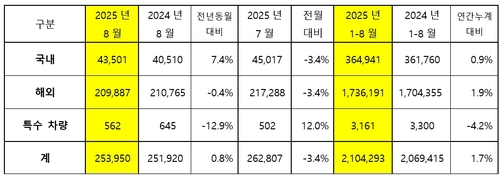 현대차·기아의 8월 합산 온라인카지노 온카판량(59만345대)은 전년보다 0.6% 확대했다. 전월 대비로는 1.3% 줄었다.