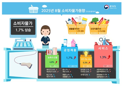 통계청이 2일 발표한 '2025년 8월 소비자물가동향'에 따르면 지난달 소비자물가는 1년 전보다 1.7% 상승했다.