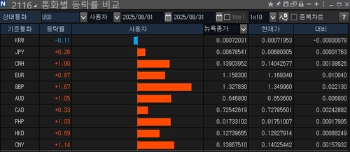 2일 연합인포맥스 통화별 등락률 비교(화면번호 2116)에 따르면 원화는 지난 8월 한 달간 달러 대비 0.11% 절하됐다.