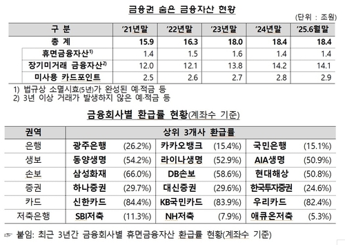 (서울=연합인포맥스) 윤슬기 기자 = 아직도 금융권에서 소비자가 찾아가지 않은 숨은 금융자산이 약 18조4천억원에 달하는 것으로 나타났다.