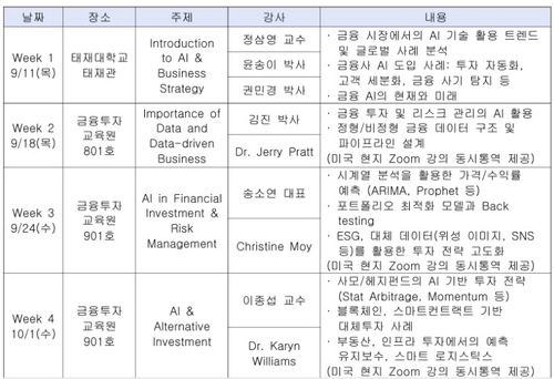 마지막으로 이종섭 서울대 교수와 스위스계 글로벌 보험사인 취리히 노스아메리카의 카린 윌리엄스 최고투자책임자(CIO)가 사모·헤지펀드의 AI 기반 대체투자 전략을 강의한다.