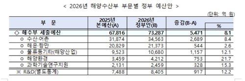 부문별로는 수산·어촌 3조4천563억 원(+8.4%), 해운·항만 2조1천373억 원(+2.6%), 물류·해양산업 1조680억원(+12.1%), 해양환경 4,212억 원(+21.7%), 과학기술연구지원 2천459억 원(+15.3%). R&D는 8천405억 원(+12.2%)이 편성됐다.