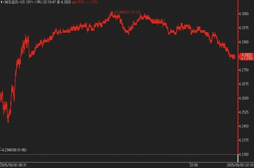 연합인포맥스의 해외금리 일중 화면(화면번호 6532)에 따르면 2일(미국 동부시간) 오전 8시 30분 현재 뉴욕 채권시장에서 10년물 국채금리는 전 거래일 오후 3시 기준가보다 7.20bp 오른 4.300%를 기록했다.