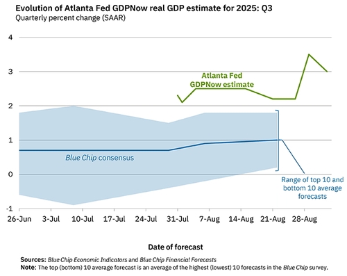 (서울=연합인포맥스) 김성진 기자 = 미국의 경제성장률을 실시간으로 추정하는 애틀랜타 연방준비은행의 'GDP 나우(now)' 모델이 2일(현지시간) 3분기 성장률을 전기대비 연율 환산 기준 3.0%로 제시했다.