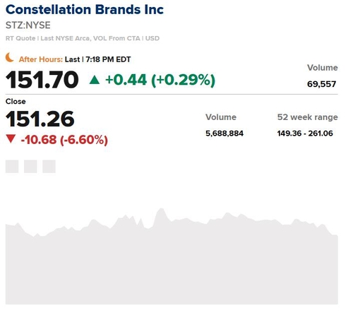 이날 뉴욕증시에서 콘스텔레이션 브랜즈 주가는 10.68달러(6.60%) 내린 151.26달러에 거래를 마쳤다.