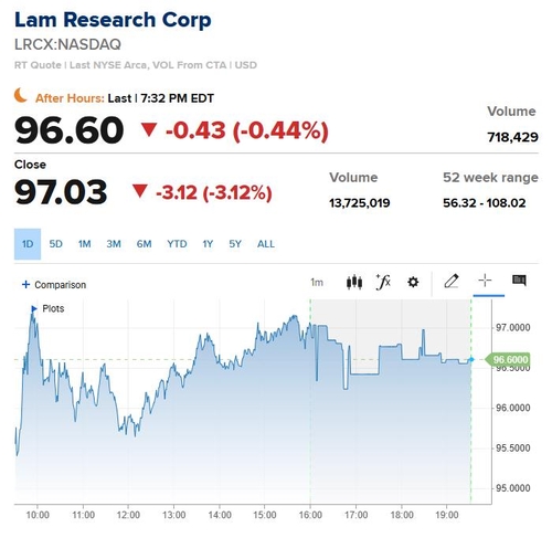 램 리서치 주가는 모건스탠리의 투자 의견 하향 악재로 3.12달러(3.12%) 내린 93.03달러에 거래를 마쳤다.