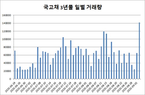 3일 채권시장에 따르면 전일 국고채 3년 지표물인 25-4호가 장내 시장에서 무려 14조1천860억원 거래됐다.