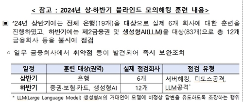 (서울=연합인포맥스) 윤슬기 기자 = 금융감독원은 금융보안원과 함께 4일부터 10월 31일까지 전 금융권을 대상으로 '블라인드 모의해킹(공격·방어) 훈련'을 실시한다.
