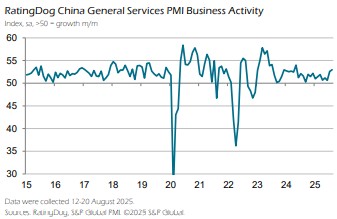 레이팅도그의 야오 유 창립자는 "서비스 PMI는 8월에 상대적으로 강한 성장을 보였고, 2024년 5월 이후 가장 높은 수치를 나타냈다"고 설명했다.