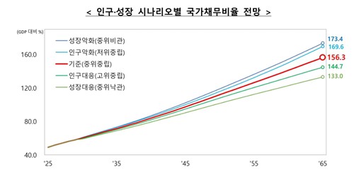 (세종=연합인포맥스) 최욱 기자 = 현재 인구 감소와 성장률 하락 추세가 이어진다면 2065년에는 국내총생산(GDP) 대비 국가채무비율이 156.3%까지 오를 것으로 전망됐다.