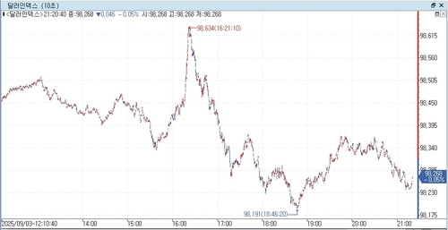 연합인포맥스(화면번호 6411)에 따르면 3일 오전 8시 20분께(이하 미 동부시간) 뉴욕 외환시장에서 주요 6개 통화에 대한 달러 가치를 반영하는 달러인덱스(DXY)는 98.242로 전장 마감 가격(98.327)보다 0.085포인트(0.086%) 하락했다.