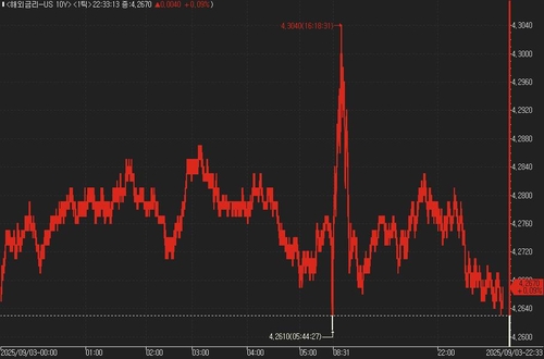 연합인포맥스의 해외금리 일중 화면(화면번호 6532)에 따르면 3일(미국 동부시간) 오전 9시 현재 뉴욕 채권시장에서 10년물 국채금리는 전 거래일 오후 3시 기준가보다 0.10bp 오른 4.279%를 기록했다.