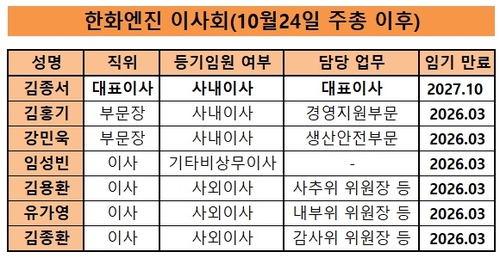 (서울=연합인포맥스) ○…한화엔진은 내년 정기 주주총회에서 대표이사를 제외한 나머지 이사 전원을 선임한다.