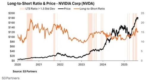 현재 엔비디아의 롱-투-숏 비율 비율은 최근 수주간 15.4까지 하락하면서 1.5 표준편차 임계치 아래에 머물러 있다.