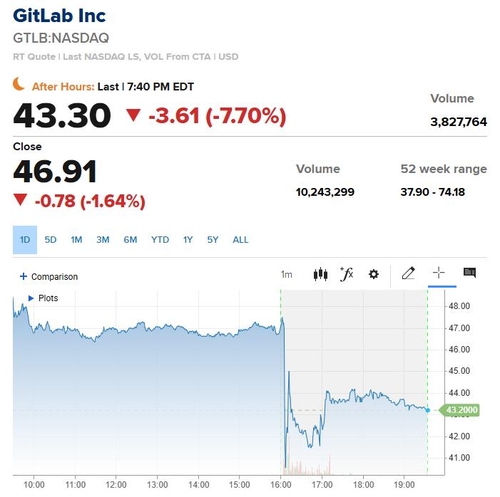 (서울=연합인포맥스) 이장원 선임기자 = 웹 기반 소프트웨어 개발 플랫폼 깃랩(NAS:GTLB)이 월가의 기대에 못 미치는 실적 가이던스를 제시한 탓에 시간 외 거래에서 7% 넘게 급락했다.