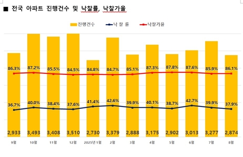 전국 아파트 경매 진행건수는 2천874건으로 전월(3천277건)보다 12% 감소했다. 낙찰률은 37.9%로 전달(39.9%)보다 2.0%p 떨어졌고, 평균 응찰자 수는 8.0명으로 비슷한 수준에 머물렀다. 낙찰률 하락은 매수세 위축으로 유찰 건수가 늘어난 영향으로 풀이됐다.