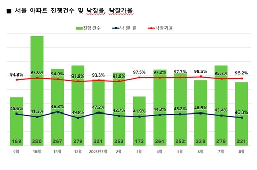 서울 아파트 낙찰률은 40.3%로 전월(43.4%)보다 3.1%p 하락했다. 낙찰가율은 96.2%로 전달(95.7%)보다 0.5%p 오르며 상대적 강세를 보였으나, 평균 응찰자 수는 7.8명으로 변화가 없었다.